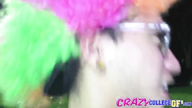 It was all about the party this week on Crazy College GFs. Everyone knows when it comes to partying, college kids reign supreme. And everyone knows there's no party like a Rave party. So when we got a submission this week that combined the two, we just sat back and watched in amazement. There were tons of sexy college girls everywhere dressed in next to nothing, and we watched as a parade of these ravers came out of the party when it ended. They were hanging around the parking area keeping the party going. The asses were out and being shaken all around. Over in a corner we could see a hot college chick sucking off a dude dressed in a blue suit. Turned out this chick was Karlee, and she was just getting started on her BF. This girl had no scruples about being recorded, as she chugged that dick and even choked on it. Her BF was heated up by then and just went for it. He turned Karlee around, as she dropped her panties, and started to bang that crazy pussy right there in front of everyone.This girl was a firecracker and only fucked harder when she knew people were watching and cheering them on. He unloaded on that pussy, as he pounded it hard on the hood of a car, and her huge tits bounced up and down. It was a high-intensity fucking that throttled up with the rave music until he exploded his load all over her pussy. This one was absolutely INSANE, and you can't miss it!