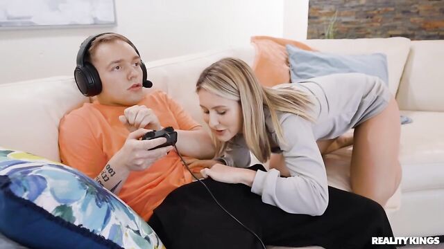 Joshua Lewis got a new video game that's taking up all his attention, so horny blonde Paige Owens decides it's time for some serious tactics: tempt him away from the screen with anal! After stretching her ass with a plug she launches her attempt, but she only gets to suck and ride his cock before he ragequits. Paige didn't even get her ass stretched... but Joshua's joystick looks like it will do the job. And when this gamer finds his GF fucking her booty with his controller, he's gotta man up and give her the goods!