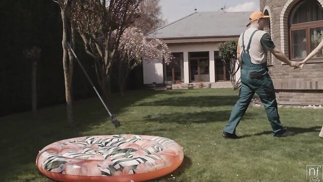 Simon Kitty is slim, busty, and oh so sexy. She takes her time changing into an itty bitty bikini that shows off all her curves. Positioning herself outside, Simon makes sure she as an excellent view of Michael Fly, the hot help.She decides on the spot that Michael will definitely do when it comes to satisfying her needs. Beckoning him over, she offers him some oil and asks him to help her out. When Michael hesitates, Simon demonstrates what she wants from him by popping her big jugs from her bikini bra and drizzling some oil onto herself. Grabbing Michael's hand, Simon presses it right where she wants it.Leading Michael indoors, Simon positions herself to take everything she's been wanting. She draws him for a deep kiss and hums in pleasure as he obediently palms her twat through her bikini bottom. Although this foreplay is nice and satisfying, Simon demands even more. She lays herself out on the couch and spreads her thighs. Pulling her thong to the side, she invites Michael in to deliver a pussy licking that just warms her up even more.When Simon sees the size of Michael's hardon, she knows that she has chosen well. She has Michael take a seat so she can lay on her side and indulge herself sucking him off. Meanwhile, Michael continues to keep Simon's party going with his fingers diddling her bare cooch. She even pushes those oiled up big ones together to give him a titty fuck.Since Michael is already sitting down, Simon just gets to her feet, straddles his hips, and slides on home. That big dick feels amazing inch by inch in her tight fuck hole! Bouncing away with her big breasts jiggling, Simon takes her first round of pleasure with the help of Michael's fingers on her clitoris.Next up Simon gets onto her back and shoves those boobs together for another titty fuck. Then she spreads her thighs nice and wide to welcome him back home. Michael accepts her invitation to dive deep, especially when Simon rolls to her side so he can spoon behind her and fill his hands with those fun bags as he keeps on thrusting.The couple goes at it in doggy next, with Simon balancing herself on the couch. Michael doesn't hold back, especially once Simon gets close to cumming. Her moans get him to pick up the pace, which is just what Simon needs to get there one last time. Getting on her knees in front of Michael, Simon sucks the stiffie until he rewards her with a pop all over those generous jugs.
