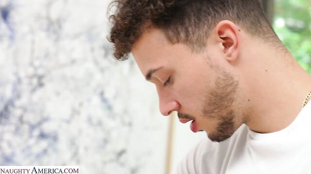 Alexa Payne is trying to decide what lingerie to wear for her vacation and gets some advice from Apollo, her son's friend. She doesn't want to get completely naked in front of Apollo, unless he's willing to get naked himself. Doing what he's told he whips out his huge cock and Alexa can't resist the size and has to have in her mouth. Let's hope her son doesn't find out that she just fucked his good friend.