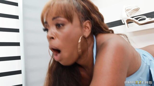 Yum Thee Boss and her man stumble into a seemingly empty shoe store to do a lil shopping. Little do they know, the foot fetishist salesman, Jimmy Michaels, is watching behind a gloryhole wall while they browse. Yum’s man doesn’t get her hard-on for heels and takes a hike to let her peruse the shoes. It doesn’t take long for Yum to discover a nice hard cock in a pair of strappy sandals looking like it’ll fit just right. Yum rocks that cock ‘til all the shoes drop and eventually drags Jimmy out from behind the wall to finish the fuck the right way.