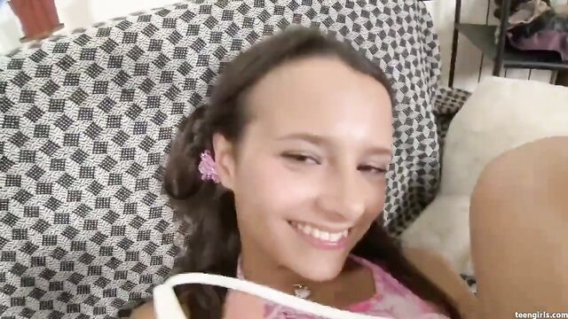 Don't you just find the sight of a luscious teen innocently reading her magazine just damn irresistible? Lounging on the couch, wearing a miniskirt that totally does not cover her booty, we get an extreme upskirt shot of her sexy pink panties. She turns her head back and smirks as she juts her beautiful teen ass in the air. Yanking up her thongs so that they're caught in her pussy lips, I don't know about you, but this brunette cutie has got me on tilt! The action escalates. You won't believe how dripping her twat gets when she starts slappin' her flap!