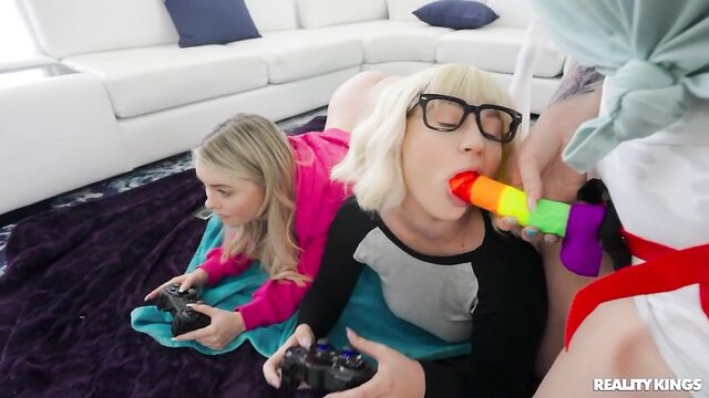 Curvy redhead Abigaiil Morris walks in on Cara May and Haley Spades hooking up in the living room, so she grabs a strap-on to give them a surprise. The horny lesbians pretend they were just gaming, and Abigaiil decides to distract them from their on-screen scores by scoring a feel of their pussies instead. She slips on the toy to fuck both babes, turning this sneaky scissoring sesh into a slutty strap-on threesome.