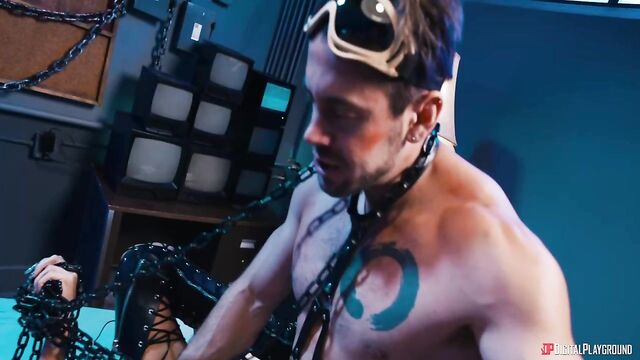 You know what they say: if you want something done right, you have to do it yourself. After escaping the firefight with the bounty hunters, Turbo (Brooklyn Gray) must go into the belly of the beast to rescue the Synthetics and finish the mission. Her fellow mercenary Jet (Brittney Kade) seduces the security guard (Dante Colle) by letting him jack off her girlcock and fuck her ass, and he even fists her hole! But before Turbo can bust out the Synthetics, she gets caught by the cell guards (Charles Dera and Will Pounder), who throw her in with them. There's only one chance for Turbo to pull this one off... pull the guards in with her by their cocks and get them off in a hot and heavy threesome. Can she snatch victory from the jaws--and balls--of defeat?