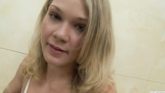 Oh, my precious Maggie, you're the only woman I know who gets dirtier after taking a shower. A stunning dime-piece through and through. Let's see, for starters, she has an amazing trim figure with outrageously massive boobs for one so youthful and did I mention her adorable print starlet face? This movie opens up in her favorite setting - the bathtub. Irresistibly clad in white and pink lingerie and a cotton top, watch her as she climbs in the tub, undies and all... Her nips coyly poke through her now see-through spaghetti string top. Then, the shower head comes to life, showering warm rain all over her shaved beaver.