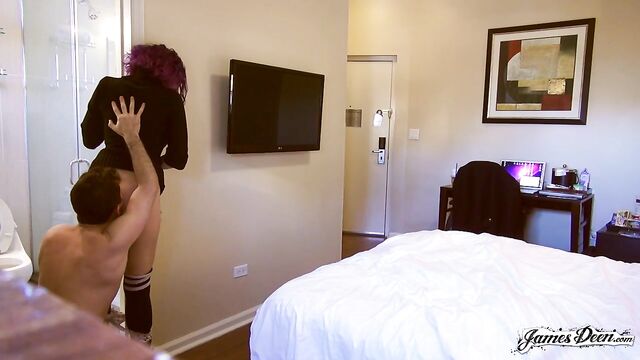 Violet with her violet hair drops by James Deen’s hotel room wearing a short black long-sleeved dress and a pair of knee-high boots. He welcomes her with only a towel wrapped around his lower body. He obviously just came out of the shower. She makes herself comfortable and sits down on the bed watching him as he brushes his teeth. James puts his pajamas on but his hairy chest remains exposed. The two have a bit of conversation as she slowly takes off her boots exposing her knee-high socks. James stops her from stripping by kissing her on the lips. He leaves him alone on the bed for a little while. He comes back and kisses her on the lips, hard. He makes her stand near the bathroom door and lifts her dress up. He is surprised seeing that she is not wearing any underwear that he buries his face in between her butt cheeks. James makes her bend down, her palms almost touching the ground, giving him more access to her already wet pussy. He takes his pajamas off and she hurriedly takes his big dick into her mouth and gives him a blowjob. Violet takes her top off leaving only her socks on. James then thrusts his big hard cock inside her tight pussy in a table top position. He lifts her up and off the bed without pulling his dick out. He lays down on the bed with her on top of him. She goes crazy as he hits the right spot on a cowgirl position and starts riding her dick hard. James stops her for a moment, makes her stand facing the wall and fucks her in a stand and deliver position. They then move again to the edge of the bed and he humps her hard from behind. Violet hops on the bed as James thrusts his big cock into her pussy again. From the missionary position, he positions her wherein both her legs are touching each other, her wet and tight pussy wraps tightly on his big throbbing dick. James Deen pulls his cock out of her pussy. He is about to come. Violet deepthroats him once more, taking his full-length member into her mouth. The two ended up really tired. Violet lays with her stomach on the bed as James sits beside her.