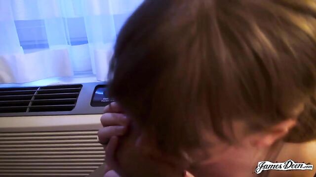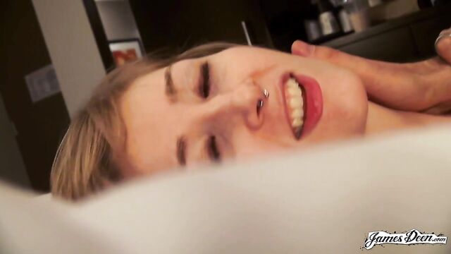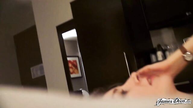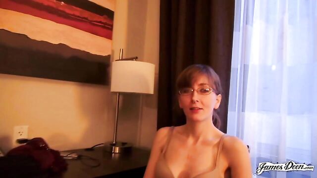 Rose Chief, dressed in a black top covered with a dark blazer and a violet scarf wrapped around her neck seems to be waiting for someone in the streets of New York. She completes her outfit with a new pair of eyeglasses, a nose ring, and a pair of lavender earrings. James Deen arrives donning a black polo under dark thick coat. With their almost matching outfits, it seems that they talked about what to wear the night before. It must be winter in New York. But didn’t stop them from walking around the busy streets of the city. They even went to a café to grab some snacks. James opts for a hot drink but Rose chooses something cold. After finishing their snacks, they decide to head to a more private places so she can start with her application. The two seemed to have checked in a hotel. With the dark curtain covers opened, welcoming the light inside the room, Rose sits in a black chair still wearing her black spaghetti-strapped blouse and tattered jeans. She then takes her top off, exposing her small tits securely held by a beige bra as she heads to the edge of the bed where James sits with his big dick ready for action. Wanting to prove herself, she deepthroats him right then and there. Rose takes his black t-shirt off as James unbuckles her belt before dragging it down her legs. He slowly thrusts his dick inside her shaved pussy. The position isn’t satisfying enough. She hops on the black chair that she was originally sitting in, her butt cheeks facing his chest. He rams his dick into his wet and tight pussy hitting her G-spot. After humping her a few times, he turns her around without pulling his dick out and fucks her in a missionary position with her back on the chair. The rough sex continues as James, with his dick still inside her tight pussy, transfers her from the chair to the edge of the bed covered in purely white sheets. He continuously humps her until his dick throbs crazily, ready to cum anytime. He then moves her into doggy-style position and fucks her hard, their skin slapping making them hornier. Knowing that he is about to come, with warm juices already dripping from the tip of his penis, Rose Chief bends on her knees and sucks him hard until he releases his cum all over her.