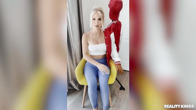 When hot blonde babe Jazlyn Ray notices Lucky Fae watching her as she records a sexy video shaking her ass and taking her tits out in the living room, she's not annoyed--this born exhibitionist pulls him in to dance with her and lets him touch her boobs! At least until Lucky's gf Jackie Hoff gets home, and Jazlyn retreats to her room, with a coatrack that gives her a wicked idea. As Jackie sucks her man on the couch, Jazlyn records a naughty solo video with a jacket and glove, making it look like a guy is squeezing her tits and rubbing her pussy. When Lucky catches her playing with herself, he dons the disguise to take her by surprise--and to evade his gf while he fucks her roommate instead.