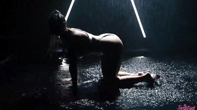 The weather may be getting colder, but here at Twistys it's only getting hotter with your December Treat of the Month, sizzling blonde Kayley Gunner. Prepare for showers, because this sultry beauty is soaking wet in her black fishnets and lingerie as she does a tease that will have your mouth as wet as her curves. Then in the gold raiment of a goddess, watch as Kayley plays with her big tits and her shaved pussy under the pouring rain, getting a toy nice and wet in her mouth and fucking herself with it for you.