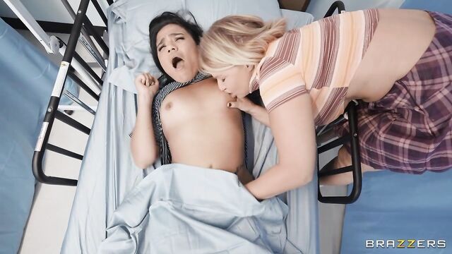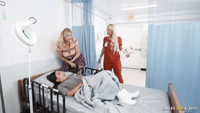 Summer Col is recovering in the hospital under the diligent eye of Phoenix Marie — the heaving, horny nurse from hell! Summer has been secretly messing around with her girlfriend (London Rivers), who sneaks into the curtained room to make out and diddle her pussy. Nothing wrong with that, right? Wrong. The nurse from hell ain't havin' it! Nurse Phoenix catches them, barges in, kicks London out, and orders Summer into a sponge bath. The nurse DOMINATES her patient, sucking and fucking her sudsy curves and crack, licking her socked feet(!), and scissoring hard. The clandestine cheeks-clapping continues until London returns, peeking through the curtain to find nurse Phoenix pounding her girlfriend's pussy with a strap-on. It looks like our patient is feeling much better!