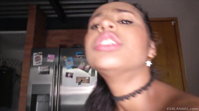 In a leotard and a sexy choker, dark-skinned Colombian beauty Indira offers her perfect, all-natural body to perverted stud Nacho Vidal. The director licks her from behind. When he buries his giant cock in Indira's juicy pussy, she eagerly humps back against his invading prick. The lewd teen kneels to suck the enormous tool before riding him some more. Nacho pushes his thick boner up her tight asshole, stretching her widely. A session of fierce anal reaming climaxes with a cum load on Indira's hairless mound.