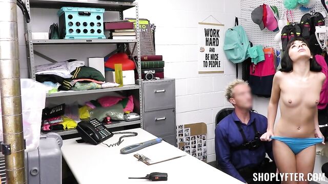 Aria is taken for interrogation under shoplifting suspicions. Officer Clarke performs a thorough process to find out who she is and what she has taken. After stripping Aria and doing a full cavity search, she seems clear, but Clarke detects her hiding a perfume bottle in a drawer when he leaves the room for a couple of minutes. Aria quickly breaks down and tells Clarke that she comes from a very conservative family, and her father doesn't allow her to wear a lot of makeup. She confesses trying to steal a perfume bottle from the mall to at least feel like other girls her age. Luckily, Clarke is understanding of her situation, offering her a mutually beneficial agreement. Aria takes her way out by giving the officer a nice blowjob and riding his cock.