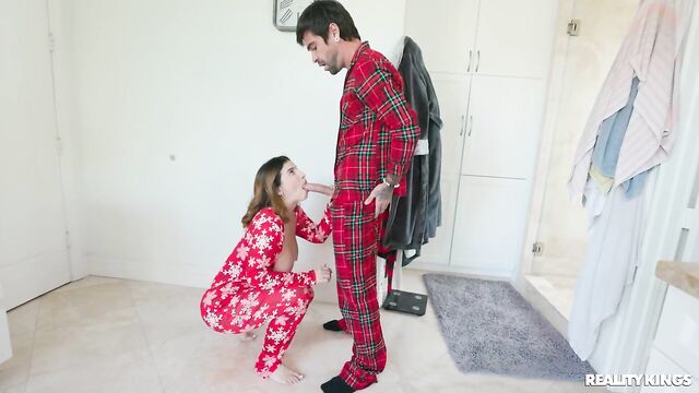 Hot roommates Angel Youngs and LaSirena69 are trimming the tree and wrapping a few last-minute gifts when LaSirena decides to pop her big tits out of her holiday PJs and flash Angel's boyfriend, Lucky Fate, behind the blonde's back. The horny roommate follows him to the bathroom and rides his cock, then takes him back to her bed, where Angel catches them. She gives LaSirena her present early: a big double-ended dildo! Angel joins in for the best Christmas Eve gift of all, a threesome and lots of cum.