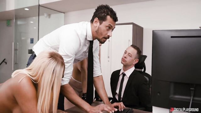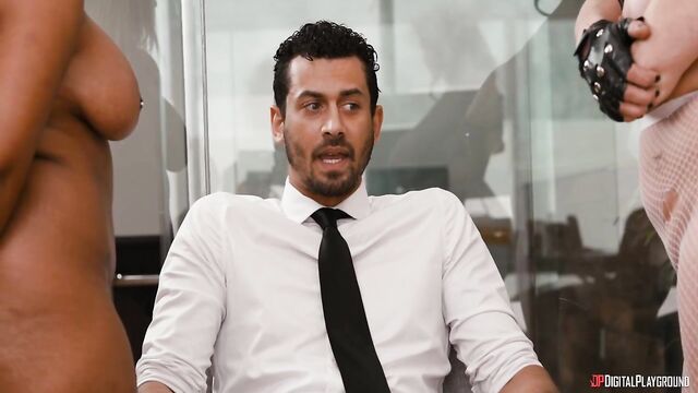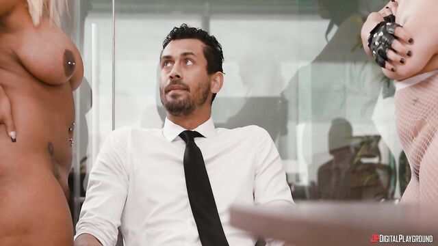 Bad Vermin babes Lace (Mona Azar) and Sasha (Avery Jane) mask up and bust in to a warehouse, taking out the security guard in a shootout, then heading for the real prize: the company offices. The boss won't transfer them his business's bank balance, but when they spot employee Shawn (Alex Jones) watching them suck each other's tits on his boss's desk, he tells them that he hates this job and he'd be happy to give them the assets. They decide Shawn deserves a reward for being such a good hostage: their ASSets!