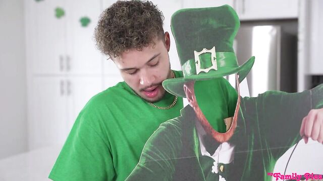 Braylin Bailey and her stepbrother Apollo Banks are decorating for a St Patty's party for Braylin's mom. Neither of them wants to be there, and Apollo deals with it by acting out. At first he begins miming a leprechaun fucking. When Braylin calls him on that, Apollo grabs a scissors and cuts the beads from around her neck. Kneeling, Braylin begins picking them up only for Apollo to pull her tight miniskirt up to reveal that she has no panties on.Braylin thinks that's the end of it, but Apollo sticks his dick through a leprechaun glory hole. She tells him to stop fucking around, but Apollo swears his dick is stuck. Braylin finally agrees to give him a reluctant handie to try to deflate his erection. Apollo can't cum, so Braylin tries a BJ. That still doesn't work, so Braylin gets on her feet and lets Apollo fuck her from behind.Apollo is finally free from the cutout, but Braylin wants that nice fuck stick to take her all the way home. Peeling off her clothes, she hops onto the island to get proper banged in the kitchen. Then she rides Apollo in reverse cowgirl so she can feel him from a different angle. On her feet, Braylin takes Apollo from behind one last time until he fills her up with his sticky St. Patrick's Day surprise.