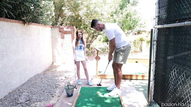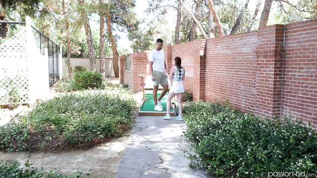 Mazy has a golf date with Dan on a private miniature gold course. They flirt during their game and Mazy escalates the situation by stripping and masturbating on the course.
