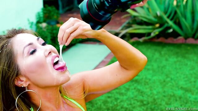 A busty, experienced Asian MILF with enormous knockers, tanned blonde Kianna Dior oils the cleavage showing from her small bikini top. The glamorous slut pours milk on her big tits and then kneels before director Jonni Darkko for a POV-style blowjob shot outdoors. Kianna lewdly sucks his balls while wanking Jonni's stiff dick; she gags on his hard prick, drooling on her chest. After her nasty display of cocksucking skills, the director spurts creamy cum all over Kianna's face.