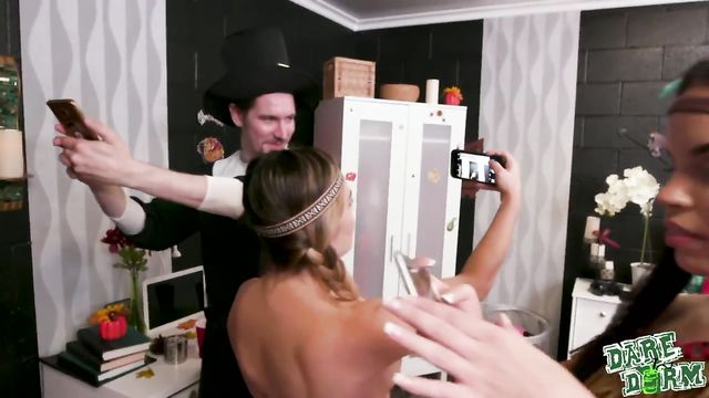Happy holidays from your friends at Dare Dorm! When college cuties Amilia Onyx, Zoe Clark and Jasmine Vega are stuck in their dorm room for Thanksgiving, they decide to have their own dinner party to celebrate. And while the table is set with cranberry sauce and some salad, these girls are craving one thing--meat! These dorm sluts are just so fucking hungry for some cock that they can't wait for Jake Adams and his friends to show up. Only, Jake arrives looking like a turkey since he forgot to bring the main dish! Luckily for Jake, all these dressed up hotties want is to take naughty selfies of each other before licking each others tits and clits! Soon, their dripping wet pussies can't wait to get stuffed! Amilia starts sucking off Jake's snake, but soon remembers that this holiday is all about sharing so Zoe and Jasmine get to feast on Jake's big dick too! One thing's for sure, this was the best dorm room fucksgiving ever!