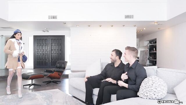 Will just got his pilot wings! To celebrate, his roommate Oliver hires a stripper with a hot flight attendant costume to give them a private show - a little extra cash and its not long before she’s sucking and fucking them both!