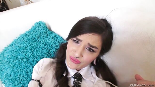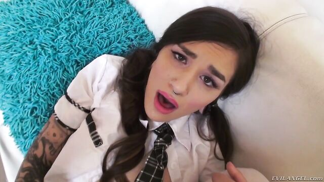 Luna Lovely, an audacious, radically tattooed schoolgirl, loves intense anal sex. She films herself teasing and masturbating on her phone, until stepbrother Mick Blue walks in and threatens to tell her parents. The young temptress quiets her blackmailing bro with a show of her body and a slobbery blow job. She buzzes her bald gash with a vibrator and the hung stud probes her asshole with toys. Luna fondles her twat through a hard butt fuck that leaves her bunghole gaping. And she gives ass-to-mouth head.