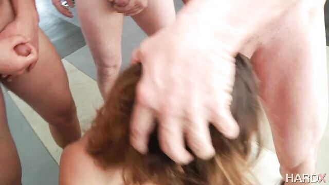 Naughty Keisha Gray is about have her first ever blowbang. This big tit beauty wants to have these 5 hot guys ram their dicks deep down her mouth. She takes turns sucking each of them off and even gets her wet pussy licked. Keisha is enjoying every sensation and wants a face full of cum from each of these guys. Keisha gets her wish.