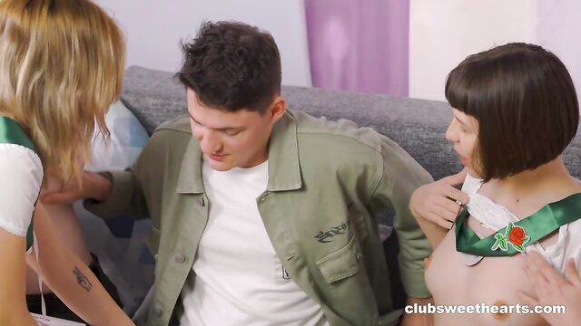 With their plan in place and hearts full of determination, our four Girl Scouts were ready to take on the world of cookie sales. Their teamwork, organization, and enthusiasm were the key to success. But their secret ingredient to a successful cookie season was actually underneath their clothes, making any man that answered the door cum with anticipation.