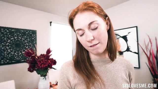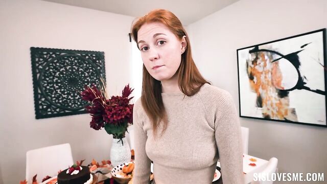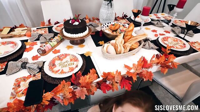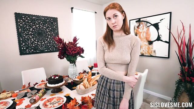 It’s Thanksgiving, and Ellie is excited about her latest purchase: a new dildo! She can’t wait to try it out, but the problem is that the family is coming to stay for the holiday, so she has to share the room with her annoying stepbrother Austin. She tries to ignore him until the boy catches her using her new toy. The next day, Ellie is doing a Thanksgiving photoshoot for her social media. Austin helps her with the pictures, but the situation arouses him so Ellie ends up giving him a blowjob. Thanksgiving dinner finally arrives and the two step-siblings have grown accustomed to doing raunchy stuff together. Profiting that no one’s home, Ellie and Austin fuck on the table, trying to avoid ruining the delicious dishes and hoping that nobody walks in while they are having sex!