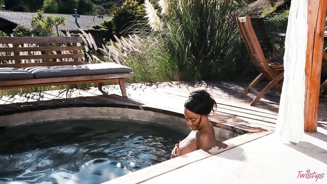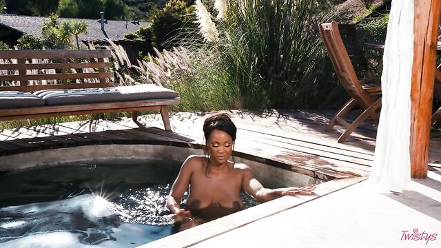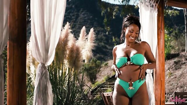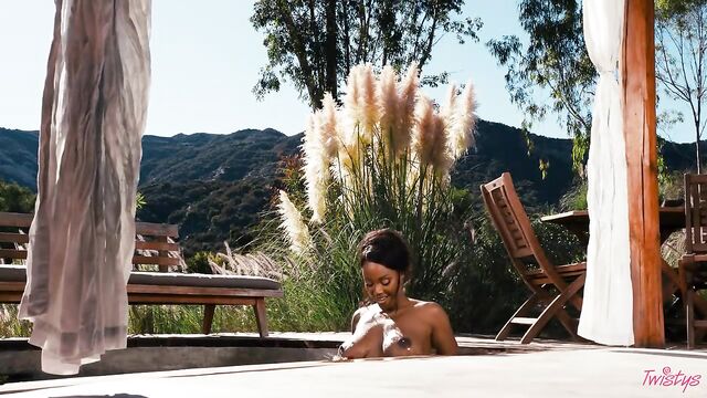 It may be getting colder outside, but you'll forget all about that when you feel the sweltering heat of August Skye, your November Twistys Treat of the Month. August starts with a tease in a bandeau top, skirt, and shimmery body chains, heating things up with lots of smoldering eye contact. Then it's time to hit the pool in a green bikini, which she pulls down to show her big tits and perfect bubble booty, shaking her ass before she has a skinny-dip! August plays with her pussy and fucks herself with a toy by the pool, bending over to finger herself, then rubbing her clit till she cums.
