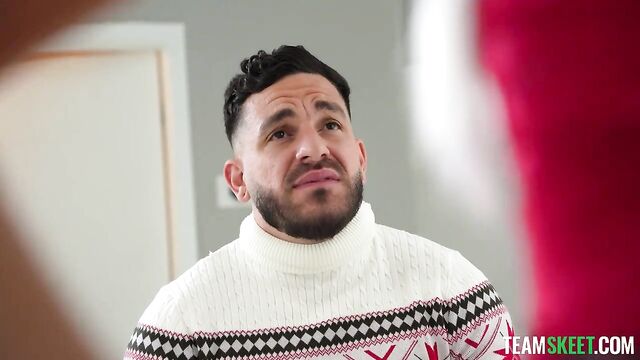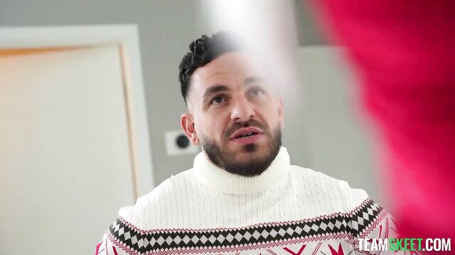 Peter and Carolina have a relationship that is going strong, so Carolina wants Peter to meet her parents. He agrees, but he’s having a hard time. Not only does he have to make a good impression, but Carolina won’t let Peter fuck her raw. All Peter wants is to feel his girlfriend’s pussy with no condom. He imagines how wet he could make her and how incredible it would feel to fill her up finally. Carolina overhears Peter on the phone as he lets out his frustrations. She knows she must give Peter an unforgettable Christmas gift. Carolina lets Peter fuck her in the living room while her parents are asleep elsewhere. They have to be quiet, but Carolina can’t help but let out loud moans. They’re almost uncontrollable, as she never thought having a cock deep inside her could feel so good. The fun doesn’t stop there. Carolina wants to go all the way and make a big mess all over the living room, so she lets Peter bust a big load in her pussy.