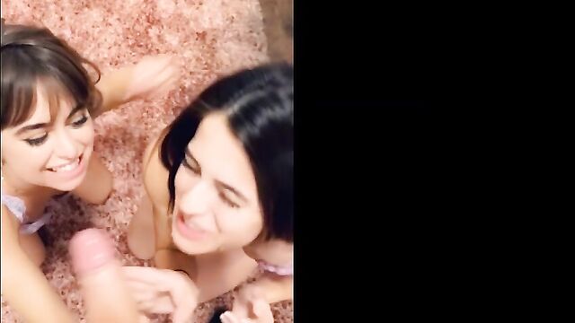 Abbie and Riley are at home wearing lingerie and text a guy to come over. He shows up and they give him a blowjob together and swap his cum after he finishes.