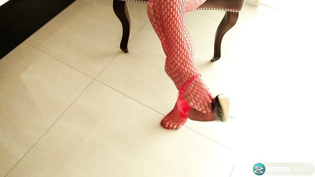 Agatha Delicious, a beautiful, sexy, 42-year-old cougar, is dressed for sex, wearing a red fishnet bodysuit that her nipples are clearly visible through, a short, black skirt and fuck-me pumps. She's hot and horny and lets you know it, talking dirty throughout the video of this scene, and eventually, every inch of fuck-me clothing comes off until she's wearing absolutely nothing. Even her feet are bare. She deep-fingers her pussy, and it's so wet, you can hear her pussy juices squishing.