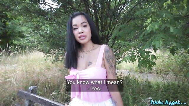 I met this tattooed babe in the park the other day named Jade Mai, and after stopping to chat, I offered her some money to show me her sexy boobs. Next, the raven-haired stunner slipped off her thong and showed me her tight pussy. I fucked it with a cucumber to see how deep it was, and then I stuck my thick dick inside! Afterwards, Jade got on her knees to suck me off before bending over to let me bang her from behind doggystyle. Next, I flipped the horny nymph over and gave her a hard pounding in missionary position, and then I wanked myself off until I showered her big tits in cum!