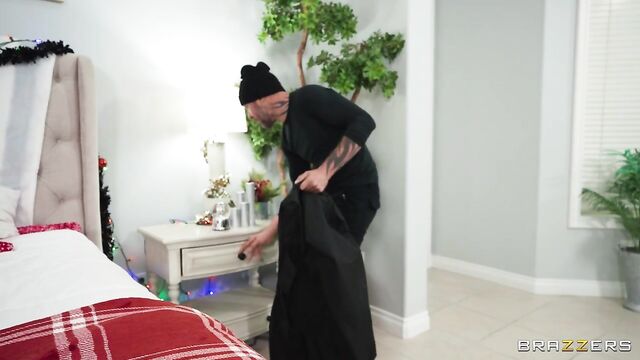 Jennifer White sets the table for her new stepfamily, and everything is finally working out perfectly. She heads to shower to freshen up before dinner when her husband, Mick Blue stops by to tell her he has a special surprise in store for her after. Jennifer dries off and enters the bedroom, only to find a burglar, Scott Nails, standing there. Jennnifer thinks he’s the surprise and gets right to it, sucking Scott’s big cock before they start fucking. When Mick catches them, he sees how much his wife is enjoying it and so in the spirit of giving he doesn’t object and instead joins them for a wild anal fucking threeway!