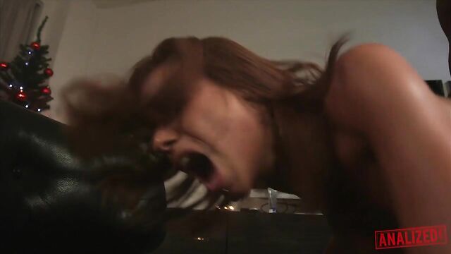 Rose Valerie is wearing a skimpy Santa Claus bikini, and is touching herself, getting ready to be fucked by the biggest cock she's ever laid eyes on. She is licking and sucking on her fuck toy to get it wet enough to go in her pussy and her ass. She uses it to loosen up her tight pussy and ass for her friend. Once her friend comes over, he whips out his BBC and makes Rose suck on it. She does so with fervor, choking and drooling on it. Once her friend is nice and hard, he lays Rose down on the bed and starts fucking her ass hard. She can barely take it, his cock is too big. He turns her over and continues smashing her from behind. Her face is a mix of pain and pleasure when her friend blows a bucket full of cum into her anal cavity.