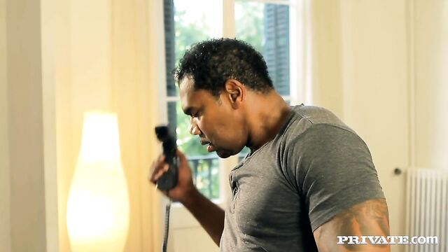 Alicia sits across from the man at the desk and as he writes, she starts to play with herself. Moving in front of him she spreads her legs for him briefly before kneeling to suck his big black cock. Tiffany joins them and soon strips naked too. The threesome fuck in several positions before the end.