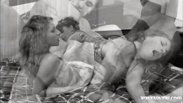 Jessica Sanchez and Rachel Evans are lying down chatting with each other as this scene begins. A man sneaks into their place and they start sharing his cock while he stares at them. As the scene changes from color to black and white, he changes from one girl to the next as he fucks them hard.