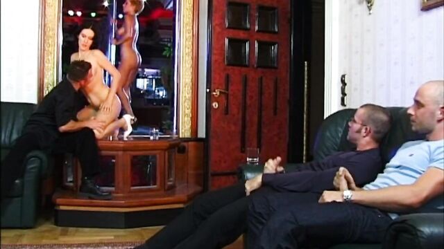 Adrienne, Katy and Monica are all dancing nude in the club while some men watch. Soon one of the girls has a guy licking her pussy and feeling up her big tits. All of the men and women join together and have a big orgy with anal sex and plenty of deep cock sucking. The guys get off before the end.