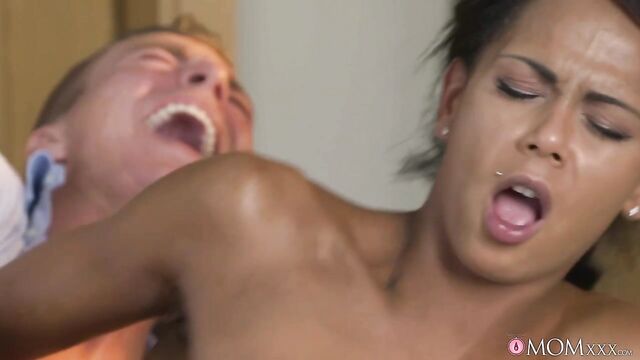 Sexy MILF Isabella Chrystin's red lace panties still carry the delicious scent of her last hot sex session. When she finds them on laundry day, she kicks off her high heels and slides her athletic body onto the washing machine to masturbate. Ricky catches the ebony beauty as she moans her way through the spin cycle, and he offers to help pleasure her perfect pussy. Isabella rewards Ricky for his help with a slow, sensual blowjob, taking extra time to lick and suck his balls just the way he likes. They move to the couch for some hardcore fucking where Isabella takes Ricky's big dick into her mouth again. He explodes in orgasm, cumming on her face and her big natural tits.