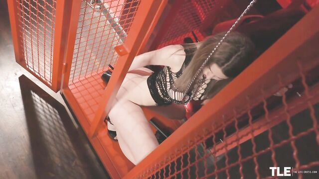 Kinky Ukrainian submissive Kiere enters a sex dungeon, her slender curves encased in a tight net micro-minidress – her large breasts and stiff nipples are visible through the mesh. She teeters on high black ankle-strap heels, her long brunette hair is worn loose, and her lipstick is scarlet. She walks to a red-painted wire cage with a mirrored back wall, and finds a chain leash attached inside, which she clips to her collar.