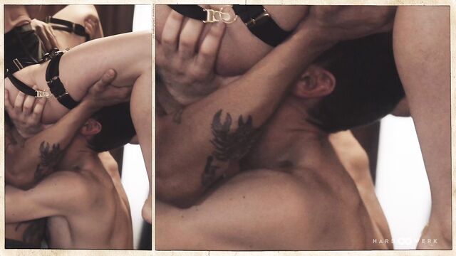 CORPORAL PUNISHMENT, CORPOREAL BLISS We are led – and almost literally so, leash and all, as lead performer Kleopatra appears blindfolded onscreen – into the second installment of HardWerk’s Triptychon series by the ring of a bell, the creak of an old wooden school desk, a nervous lick of the lips and three waiting figures. Hanging in the air with it all: anticipation, intention, veneration. It’s not for nothing that the filmmakers have adopted a slower pace for this intense gangbang – there’s a meditative quality to the echoing spanks and answering whimpers, to the push and the pull, to effortless dance of desire between the four participating performers; an absolute presence of mind and an absolute presence of flesh. As with the previous Triptychon film, the composition finds its own seamless choreography across multiple perspectives, so creating stunning juxtapositions between pain and pleasure; between a hand tightened around a throat and the easy laughter in each moment of disarming tenderness; between the polish of ‘pre’ and the primal of ‘right now’…