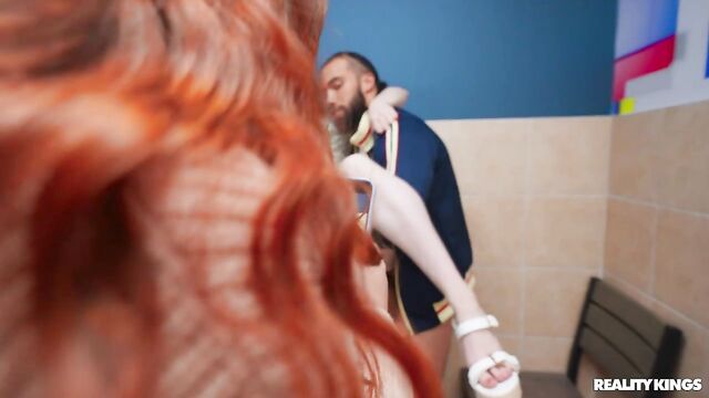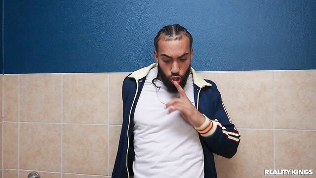 The college dining hall men's room is out of order, so James Angel decides to risk the women's. He's in the stall when Hazel Moore and her bestie come into the bathroom to take some nudes! He thought he was gonna get busted, but he hears them talking about Hazel's bush and wants to get a look. Hazel sucks James, and her BFF walks in on them and gets it on video as James fucks her!