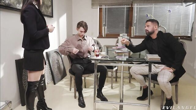 Boss Lorenzo Viota considers tall, raven-haired secretary Helena Valle a godsend. While he and Tommy Gold chat, Helena swoops in to show Tommy how perfectly their product will fit his needs. But the sexy beauty spills coffee on Tommy. She makes it up to him, licking the mess from his body! That initiates an intense devil's threesome. Under the table, Helena gives the men a slobbering, double blowjob. Lorenzo throws her on the couch and power-plows her pussy. Helena sucks one dick while the other drills her twat, with the guys switching spots at various times. Lorenzo stuffs his meat into her booty, and Helena whimpers in lust through the anal ride. This epic session intensifies with nasty double penetration for Helena, one prick in her poon and the other porking her asshole! Helena poses her gaping rectum and gives messy, ass-to-mouth head. The guys finish her off with two creamy cum facials!