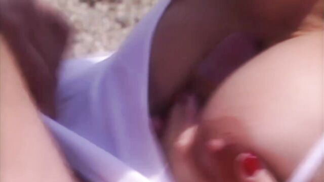 Sandra Iron arrives on the beach where a man awaits her. They start making out right away with him feeling up her nice tits through her clothes. He fucks her tits while she is giving him a blowjob and then he fucks her pussy from behind. Her big tits bounce as he screws her and finally cums on her.