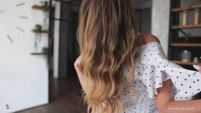 This combination of sexiness and cuteness is mind-blowing. Video Release 614 shows Sandrasy, a ravishing beauty with a gorgeous smile, long brunette hair, and a body to die for. She brings a unique charm to the table, and Said Energizer is there to capture it all. This StasyQ model knows you love lacy lingerie. It suits her well due to her bombastic curves and flawless skin. With a booty so fine it will shake your world, Sandrasy starts her seductive dance in a luxurious apartment. Little by little, she takes her clothes off, all while her gaze stays fixed on the camera. This blue-eyed seductress in high heels hops on a kitchen aisle where she caresses her fiery curves, but soon, she takes the show to a big bed. As her erect, pink nipples stay as proof of her arousal, Sandrasy continues to touch her body in ecstasy.