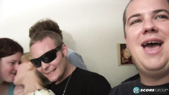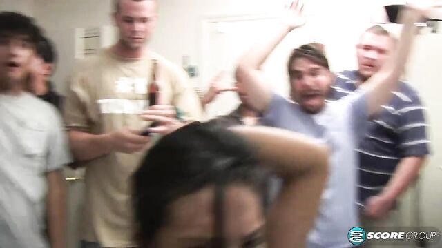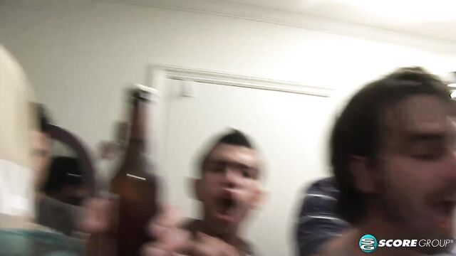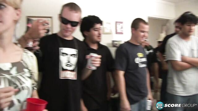 Thinking that things seem a bit quiet, some of the party-goers open a bedroom door to find Emy and Commando on the bed. The horny couple proceeds to strip and Commando gets his cock sucked before they get into wild fucking while a large group of onlookers make comments and get very jealous. Could you perform at all with so many noisy people around?