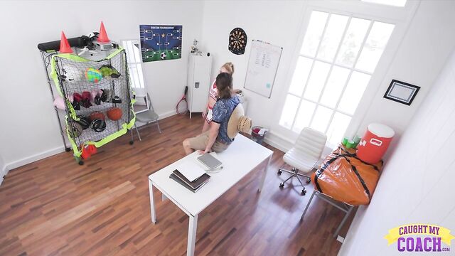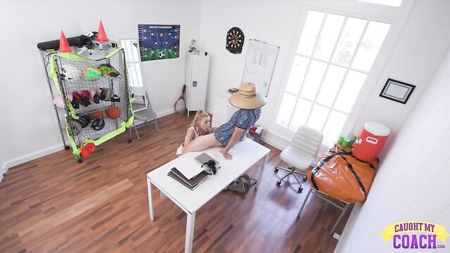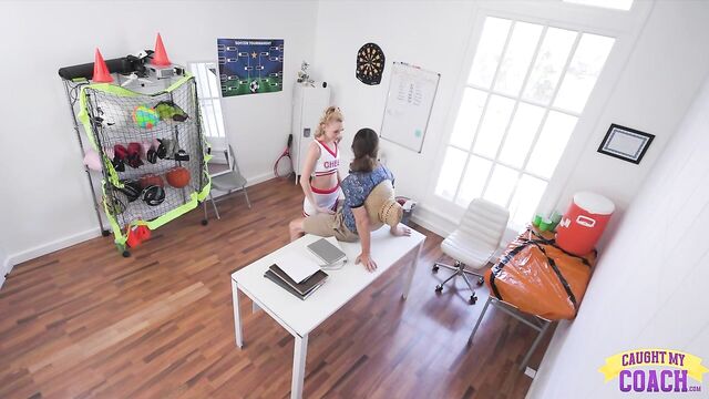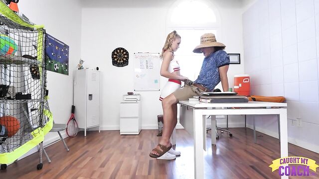 Khloe Kinglsey visits her coach Bruce Venture after he calls her into his office. Evidently Khloe hasn't been wearing panties beneath her cheerleader uniform and the guys on her team have complained. After some debate and arguing, Khloe begins chasing Coach around the room to get him to touch her. She figures Coach won't have a problem with her lack of underwear once he sees how much he enjoys it.When Khloe finally gets Bruce where she wants him, he's seated on the desk with her standing between his legs. She reaches out to feel how hard Coach is and then springs that stiffie free from Bruce's shorts. She begins with a BJ on her knees, but soon Khloe is back on her feet and riding Bruce in reverse cowgirl.Now Bruce becomes a more active participant as he dicks Chloe down while she leans over his desk. Laying on his own desk, Bruce watches as the petite cheerleader mounts him for a cowgirl ride. Bruce slowly gets Khloe on her back so he can keep on pounding that trimmed snatch right up until he blows her full of cum. Bruce leaves to get a towel as Khloe tugs her miniskirt down, then returns and tells Khloe to get out.