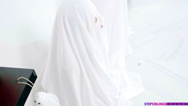 Ricky Spanish is checking out some ghost decorations when his stepsister Lana Smalls and her friend Molly Little walk in. Lana is talking about wanting to fuck her stepdad, and she gets an idea when Ricky mentions that his dad is going to be looking in on the ghosts. The girls wait for Ricky to leave and then come back in, naked, to put the ghost costumes on themselves.Ricky returns and shoves his dick into first Lana's mouth and then Molly's. Molly goes on to sneeze, which causes her and Lana to each lift their sheets. Acting surprised it's Ricky instead of his dad, the girls exchange glances. Molly announces she wants to see Lana fuck her stepbrother, so the threesome relocates to the couch to make that happen.The girls kick it off with a double BJ. Then Lana gets on her knees to eat Molly out as she enjoys getting dicked down in doggy for Molly's eyes only. After the girls have swapped out so Molly can enjoy Ricky's hardon, Lana rides her stepbrother in reverse cowgirl. She cedes the D to Molly and trades out for riding Ricky's tongue. Molly gets on her back for Ricky to do her one last time, and then Lana takes it for the home stretch as she splays herself for Ricky. Pulling out, Ricky gives the girls a nice pop to enjoy.