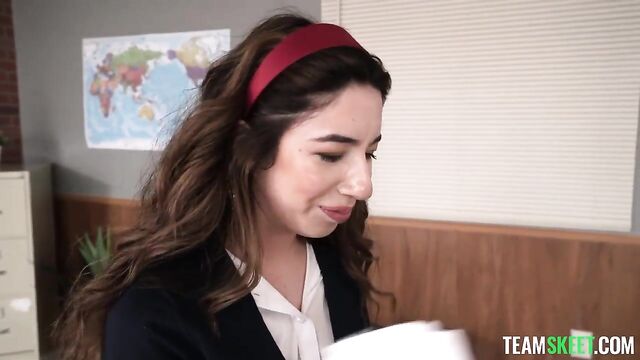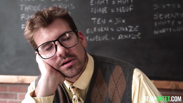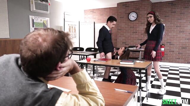 Nikki is the school’s slut but she has a secret, nerds kinda turn her on. That’s why she loves the school presidential debates because she gets to hide under the podium and have a little fun of her own with the candidates. The two contenders this year are Juan and Camilla, but it’s Juan who steps to the podium first. As soon as he does, she drops his pants and gags on his big cock like the hungry slut that she is. Then Camilla is up, and she gets the same treatment, with little Nikki eagerly eating her pussy like it’s ice cream or something. Nikki knows they really want to fuck each other so this is only the beginning. The fact that their teacher is sleeping on his desk, right next to them, only makes everything extra fun for her.