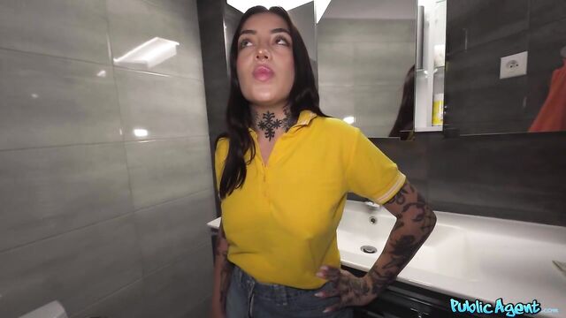 Sexy Argentinian Tabatha Lust delivered the pizza I’d ordered to my car, and I offered her extra cash if she showed me her big boobs. We sneaked into the bathroom for more privacy, and after checking out the thong-clad babe’s hot body, I offered her merch in exchange for sexual favours. Before I knew it, Tabatha was on her knees sucking me off, and then she stuck out her juicy bubble butt and took a doggystyle fucking. The tattooed slut treated me to another blowjob before bouncing her tight pussy on my cock in cowgirl. She took her top off so I could see her incredible titties, and then she rode me in reverse while I spanked the dark-haired nympho's fine ass. Her snatch felt so good, I was soon ready to cum, so I pulled out and spunked a load on Tabatha’s pierced tongue!