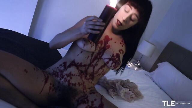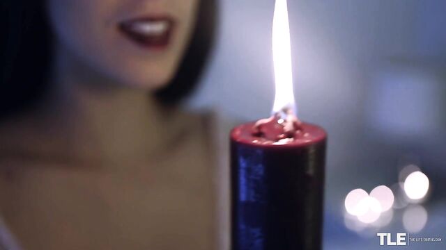 Horny Violet Russo, a smoldering-hot brunette with sexy bangs and vampish burgundy lips, is mood-lighting her bedroom with candles. Dressed in a cute top and miniskirt, she arranges white tea lights on the bed and nightstand to provide a warm and sexy glow. Then she unwraps a larger candle, made from wine-red wax.